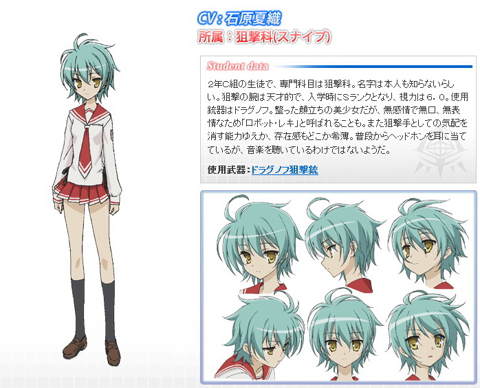 2 年 C 班的學生,專門科目為狙擊科,本人似乎也不知道自己的姓名。在狙擊上擁有天才般的技術,入學時就擁有 S 級的成績,視力是 6.0。使用武器是德拉古諾夫。因為總是面無表情、又無口的美少女,所以也被稱為「機器人・蕾姬」。此外,作為一個狙擊手她本身的存在感也相當低,平常就戴著耳機,但似乎不是在聽音樂。