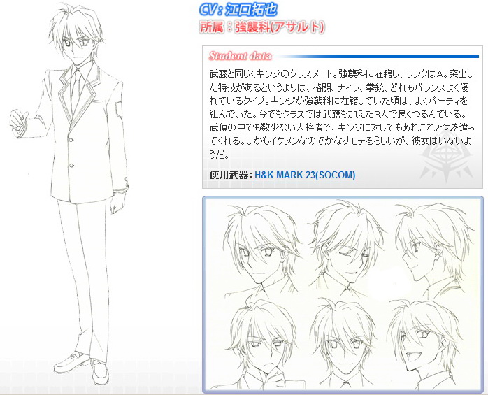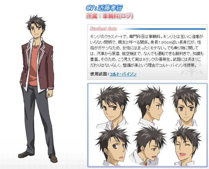 金次的同班同學,專門科目為車輛科,與今次是不需要有所顧忌的親友。身高接近 190 公分,個性非常粗魯,在女生之間一點也不受歡迎。但是無論對於汽車、