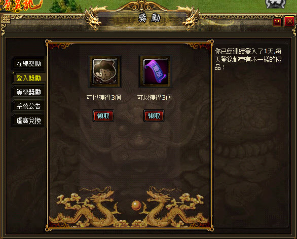 三龍爭霸撼動神州,神恩浩蕩天降豪禮!在大唐真龍的遊戲世界裡,人人都有獎拿!獨家新手線上獎勵功能,只要玩家持續在線達一定時間,就能獲得各式各樣的豐富好禮!連續三十天,天天都登入遊戲的話,還可額外獲得更多豐厚的獎項。舉凡銅錢、經驗丹、銀票、寶石、背包…等,舉凡新手想要的,全都幫您準備好,就等您上來拿!