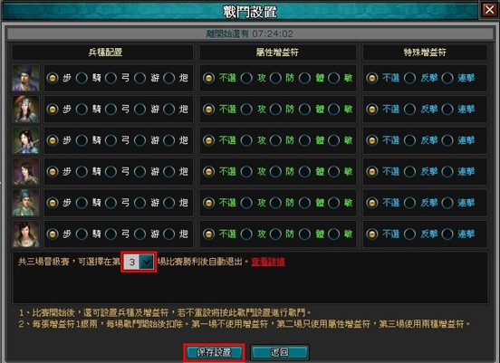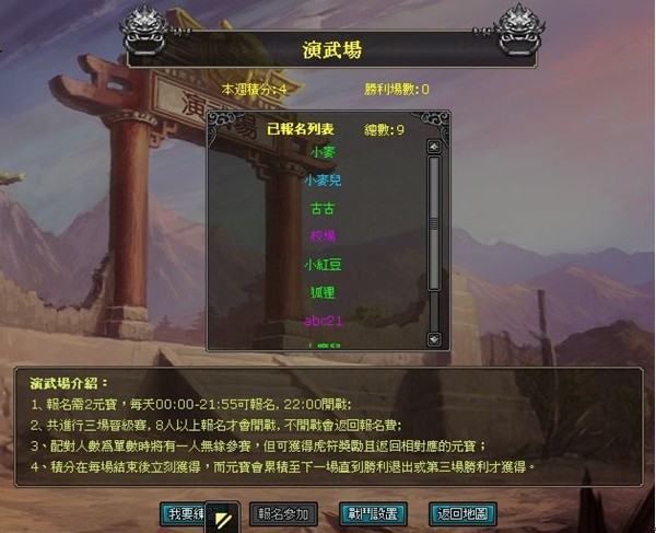 演武場今後將在每天 22:00 開始,每伺服器當中滿 8 人以上報名才會開戰,不開戰會退回報名費。共三場晉級賽,每場比賽中玩家進行一對一隨機配對戰鬥,每場結束後會有幾分鐘時間給玩家設置下一場戰鬥使用的兵種及增益符,每場比賽配對人數為單數時將有一人無緣參賽,但可獲得虎符獎勵且退回相對應的元寶。
