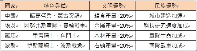 ● 中國─糧食生產、建築工藝 遙遙領先:以勤儉誠樸立下世世代代典範的中國,在糧食生產與建築升級皆優於其他國家,擁有諸葛弩兵與威震八方的蒙古突騎是打下千年王朝最強大的後備軍。