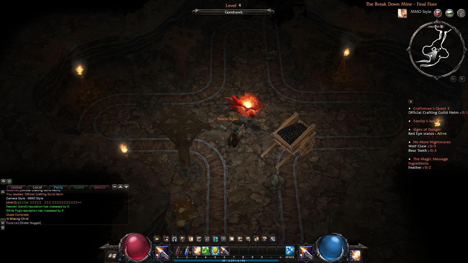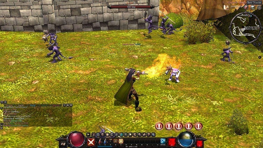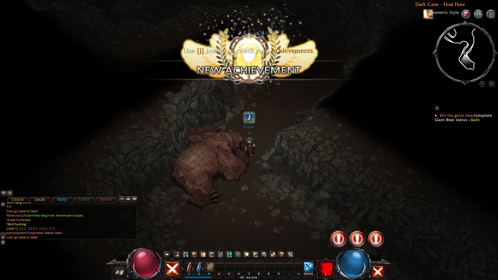 進入地城後就可以開始大殺四方了。一開始的新手地圖主要敵人只有一隻熊怪,幾乎不會有什麼危險性,可以先在這邊熟悉戰鬥方式跟介面。介面上,有玩過暗黑系列的玩家應該都很熟悉左右那兩顆球形的生命值、法力值顯示;而左右兩側各有一個技能格,可以用來對應滑鼠左右鍵的施展技能。中間的部份,則是多了一整排的鍵盤技能格;可以將不常用或是設置型的技能設定在這裡,而最常用的攻擊技能設定在滑鼠,這樣比較方便操作。