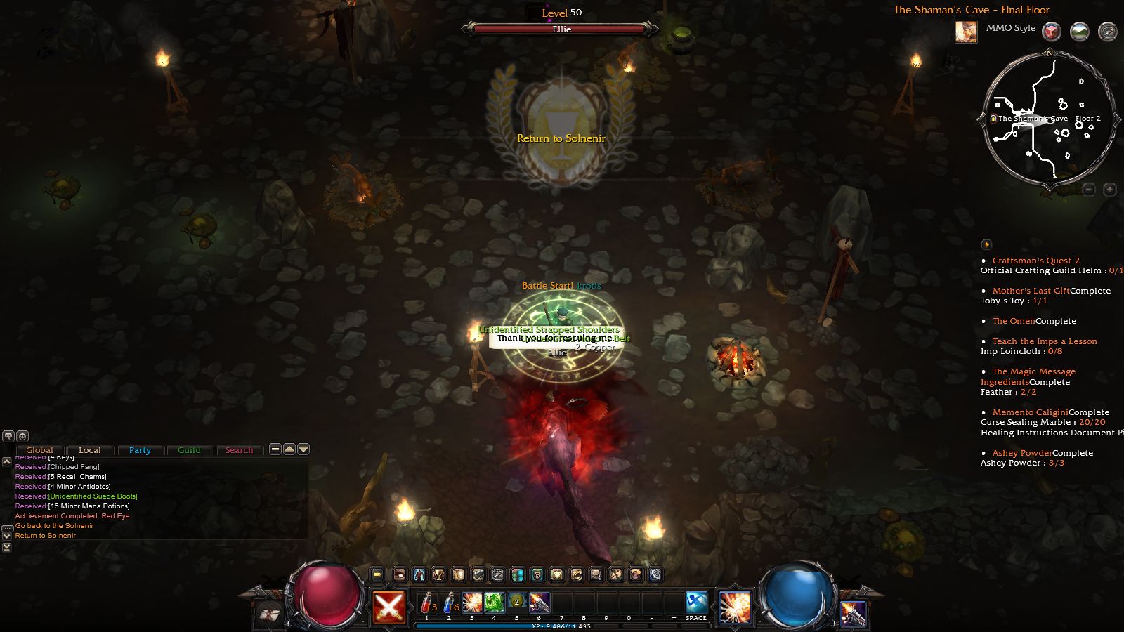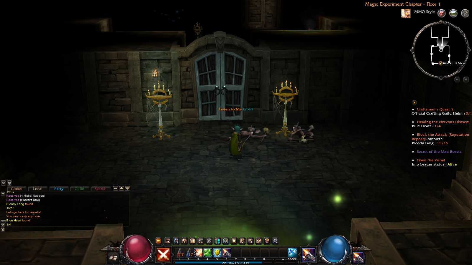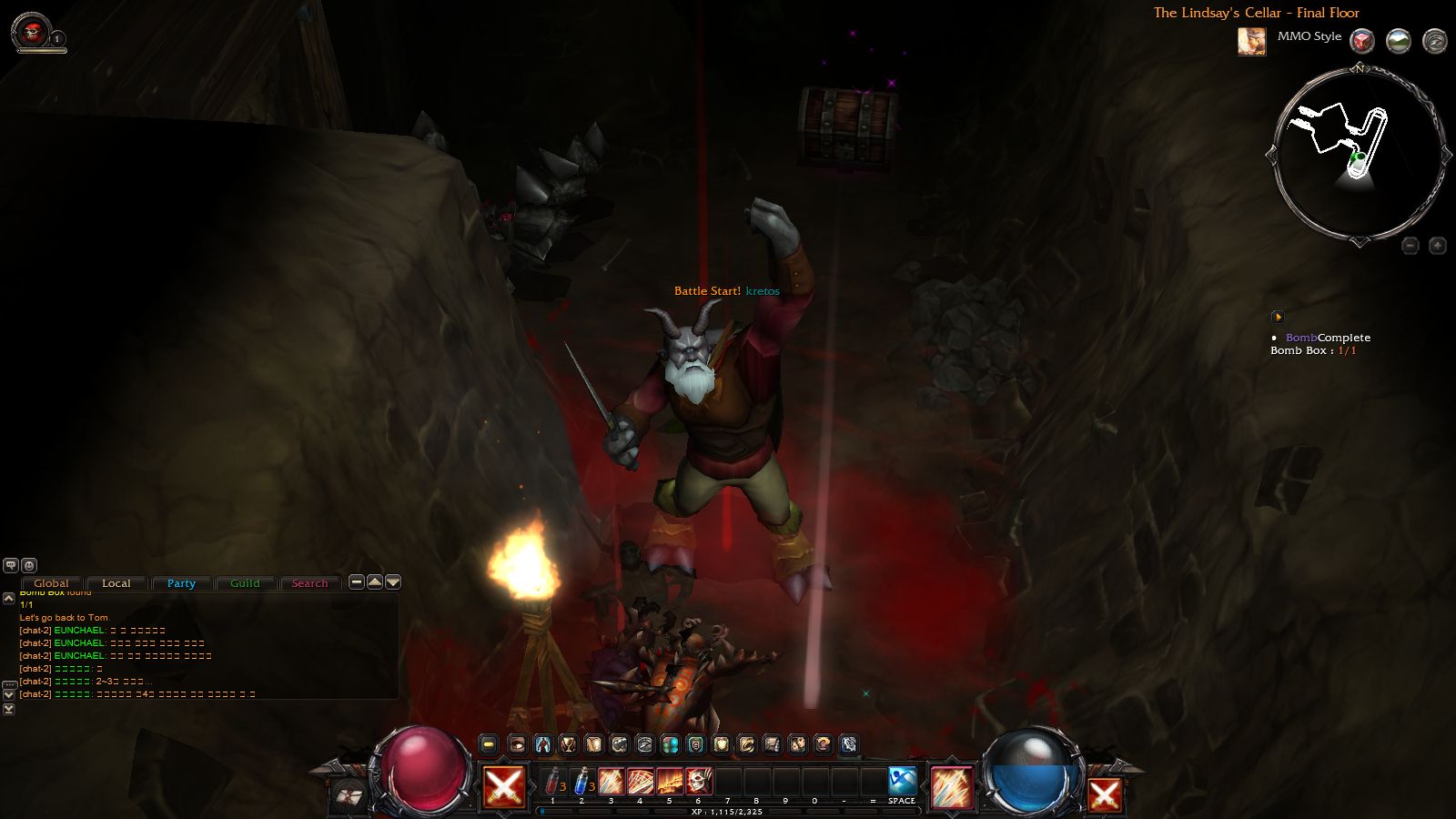 進入地城後就可以開始大殺四方了。一開始的新手地圖主要敵人只有一隻熊怪,幾乎不會有什麼危險性,可以先在這邊熟悉戰鬥方式跟介面。介面上,有玩過暗黑系列的玩家應該都很熟悉左右那兩顆球形的生命值、法力值顯示;而左右兩側各有一個技能格,可以用來對應滑鼠左右鍵的施展技能。中間的部份,則是多了一整排的鍵盤技能格;可以將不常用或是設置型的技能設定在這裡,而最常用的攻擊技能設定在滑鼠,這樣比較方便操作。