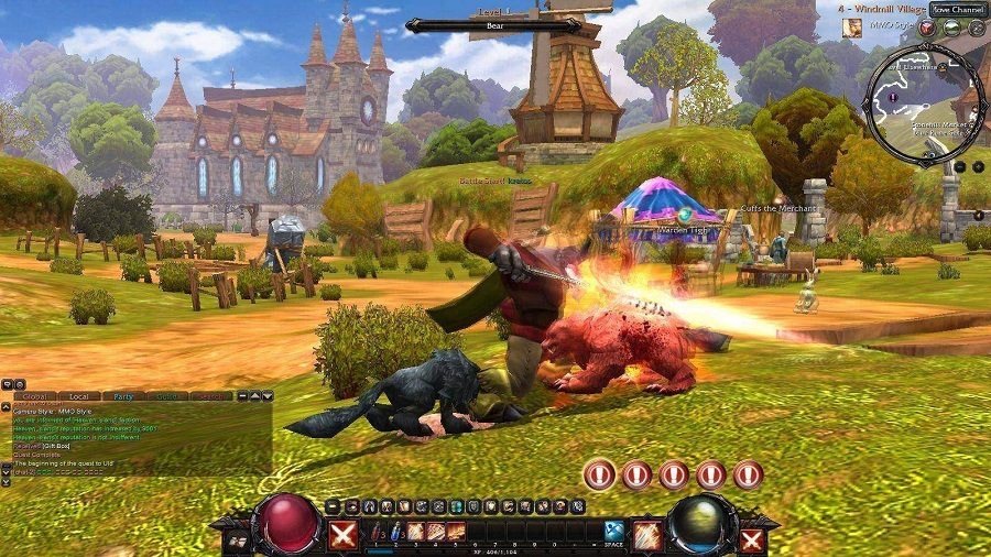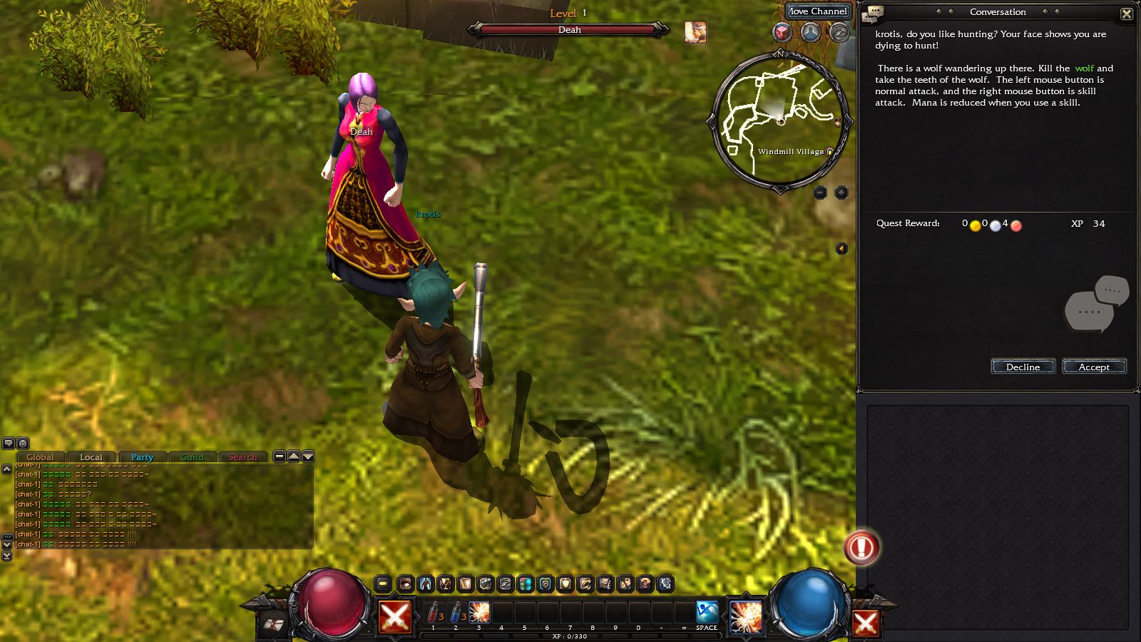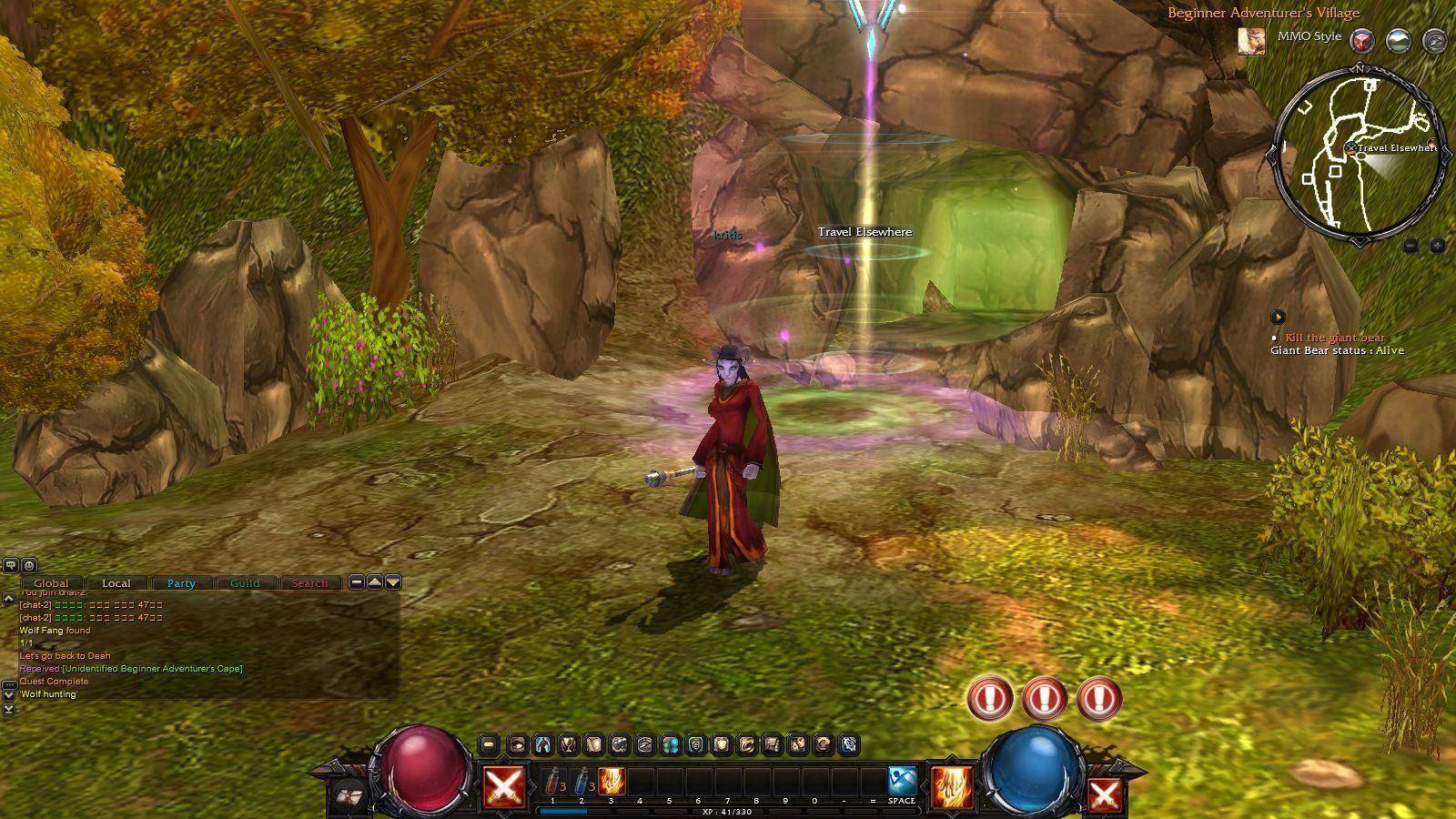 首先順著頭上箭頭的方向找到任務指引員「Deah」,她會要你小試身手,把後面一隻晃來晃去的狼除掉(按下滑鼠左右鍵就可以攻擊),接著就可以接下前往附近洞窟中除掉暴走熊怪的任務。