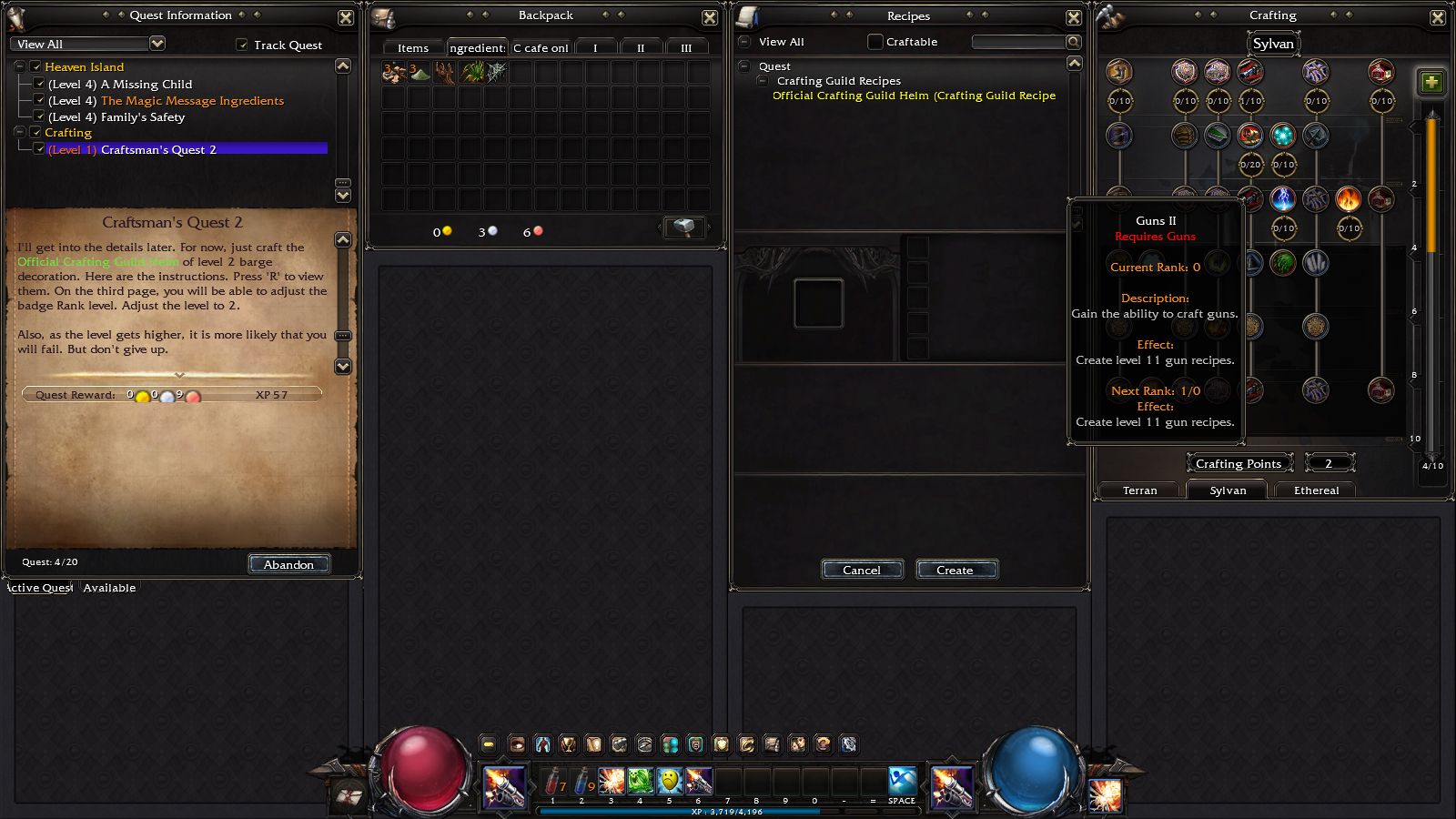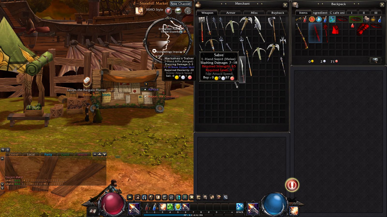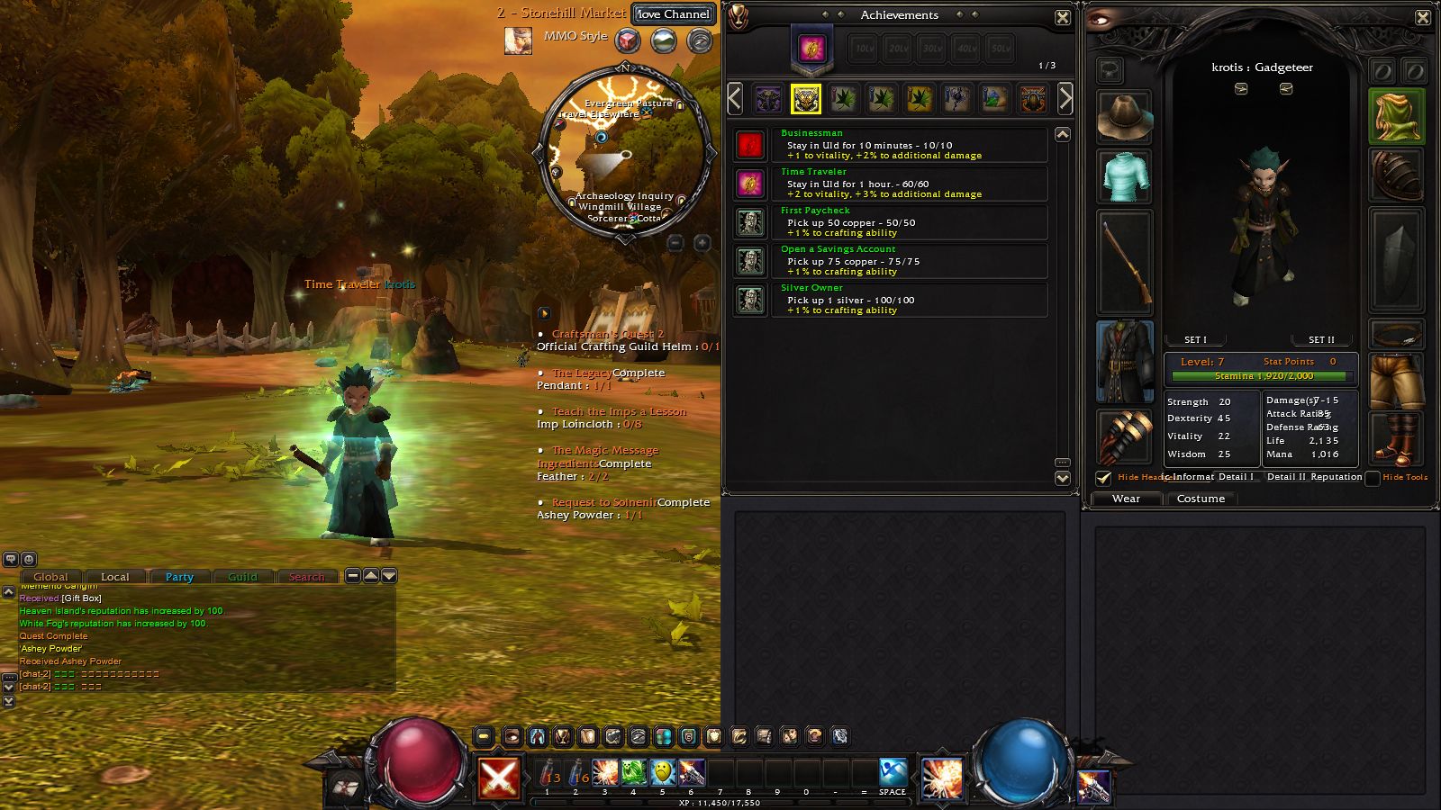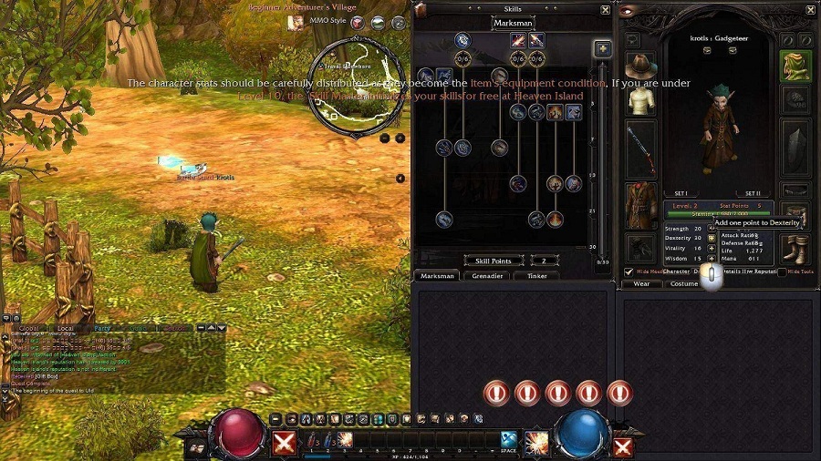 Tinker)的技能,大部分都是設置型的陷阱、機械,如自走炸彈或誤導木人樁等,這類比較適合放在鍵盤技能格;而機械士「火槍」系(Marksman)的技能如「快速連射」,就可以設定在左右鍵,發揮連點的功力迅速連發。解決熊怪後就可以回新手村還任務,做第一次升級後的配點選擇。