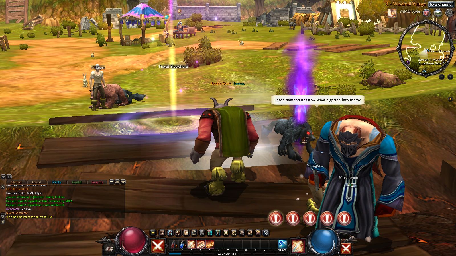 傳送門離開這裡正式展開冒險了。若是不習慣 45 度角的鎖定畫面,可以自由切換設定為一般線上遊戲的自由視角畫面,只是地城中用自由視角平平的看過去,實在很容易被擋到視線,所以建議村莊中用自由視角、地城中還是用 45 度俯視模式比較好,否則被後面的怪物偷襲都看不到。