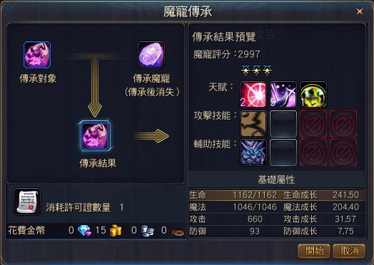 | 透過傳承,可以讓老魔寵優異的屬性移交給新魔寵 |