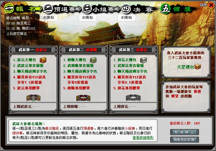 玩家可以在遊戲中各國國都中,點選右上角的「西域」前往西域地圖;要注意的是,西域崇尚強者,只有 30 級以上的玩家才可以造訪西域的國土。武林大會的會場就設置在西域內,玩家在每週一 00:00 至週三 21:00 前都可以進行報名,週四及週五會展開分組預選賽,週六則進行準決賽,只有在準決賽中獲勝的強者,才能挺進週日的總決賽。當玩家報名完成之後,若角色升級或是更換裝備與技能,在週三 21:00 前都可以去更新你角色最新的狀態,保持你的強悍戰力。