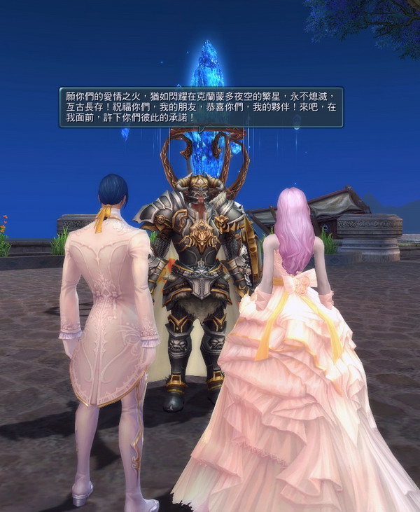 在慶典的最後,在自由港擁有著極高聲望、充滿堅毅不拔氣息的獅心騎士團副團長雷吉瓊斯,更將親自成為玩家愛情的見證人:「願你們的愛情之火,猶如閃耀在克蘭蒙多夜空的繁星,永不熄滅,亙古長存!」雷吉瓊斯會給予玩家白馬王子與