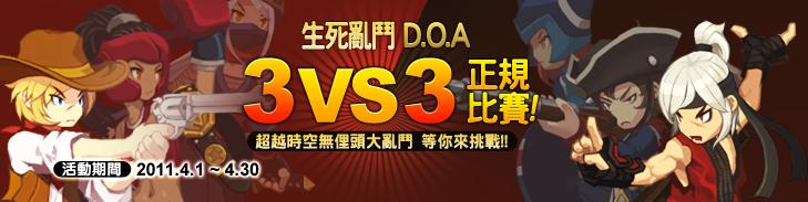 第一屆 D.O.A 生死亂鬥 3 VS. 3 正規賽正式展開!活動已截止報名,並公開了比賽入選隊伍及預、複賽賽程表。屆時將從線上爭奪《第一屆生死亂鬥》的前 16 強隊伍,所有賽況影片與成績,將會即時於官方網站公布,有興趣的玩家可以至官方網站活動專區觀戰。