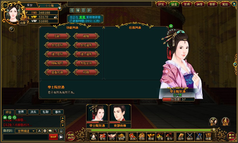遊戲中提供請安、召見、提拔、引見等十餘種的互動方式,重現古代宮廷生活,讓玩家體驗宮廷中的各種階段官品的權力象徵。