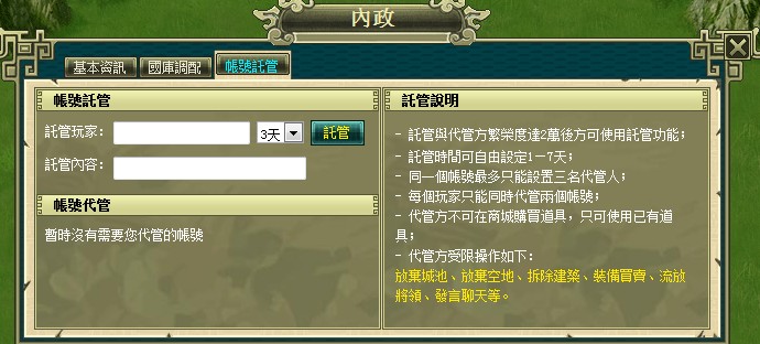 遊戲內建獨特的代管系統,玩家只要達到繁榮度 20000 即可開啟此系統。詢問對方同意後,就可以使用類似遠端的功能,讓朋友在你繁忙時幫您升級建築、攻城掠地,但又能保障你的帳號安全。