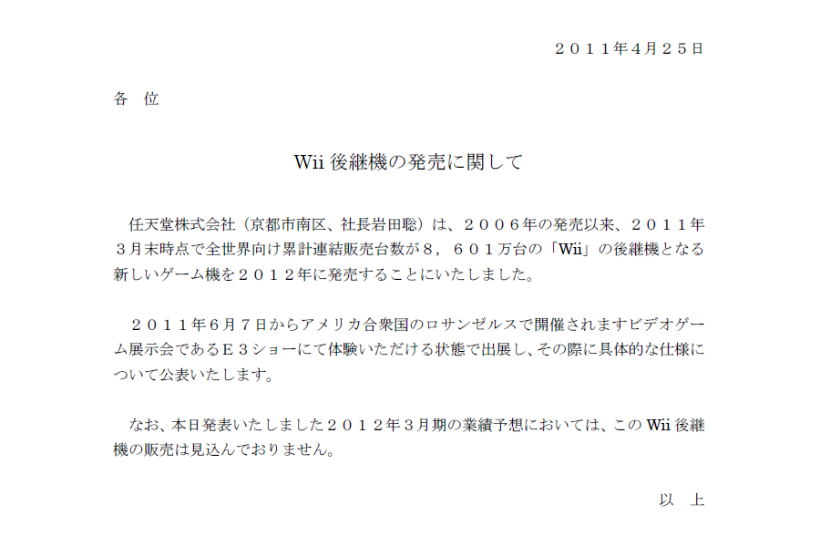任天堂今(25)日正式宣布,將於 2012 年推出 Wii 後繼機種,並預定於 6 月 7~9 日在美國洛杉磯舉辦的 E3 展中提供試玩展出。