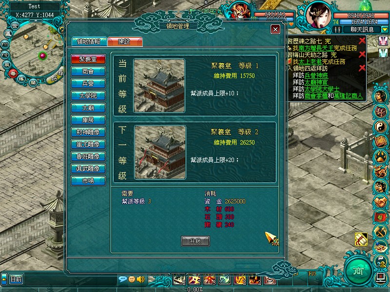 幫派可以升級,升級後的幫派可以提供給幫派成員更多的功能,同時幫派的升級需要滿足某些條件,達成這些條件需要幫派成員的共同努力;幫派的升級需要到幫派管理員處申請,如果達到升級條件,則直接升級成功。
