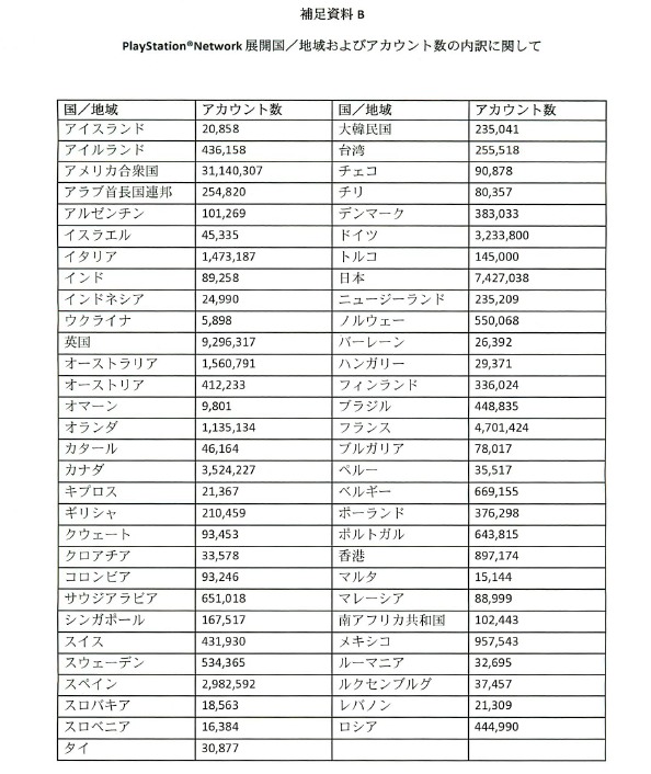 根據資料顯示,PSN 目前全球共有約 7700 萬個帳號,包括美國 3114 萬 307 個、英國 929 萬 6137 個、日本 742 萬 7038 個、法國 470 萬 1424 個、加拿大 352 萬 4227 個、德國 323 萬 3800 個、西班牙 298 萬 2592 個,以及非洲、歐洲與亞洲(※)等地區,其中包含信用卡資料的帳號約有 1000 萬個。全球 5000 萬台 PS3 中約有 3700 萬台曾連接 PSN,PSP 約有 1600 萬台。