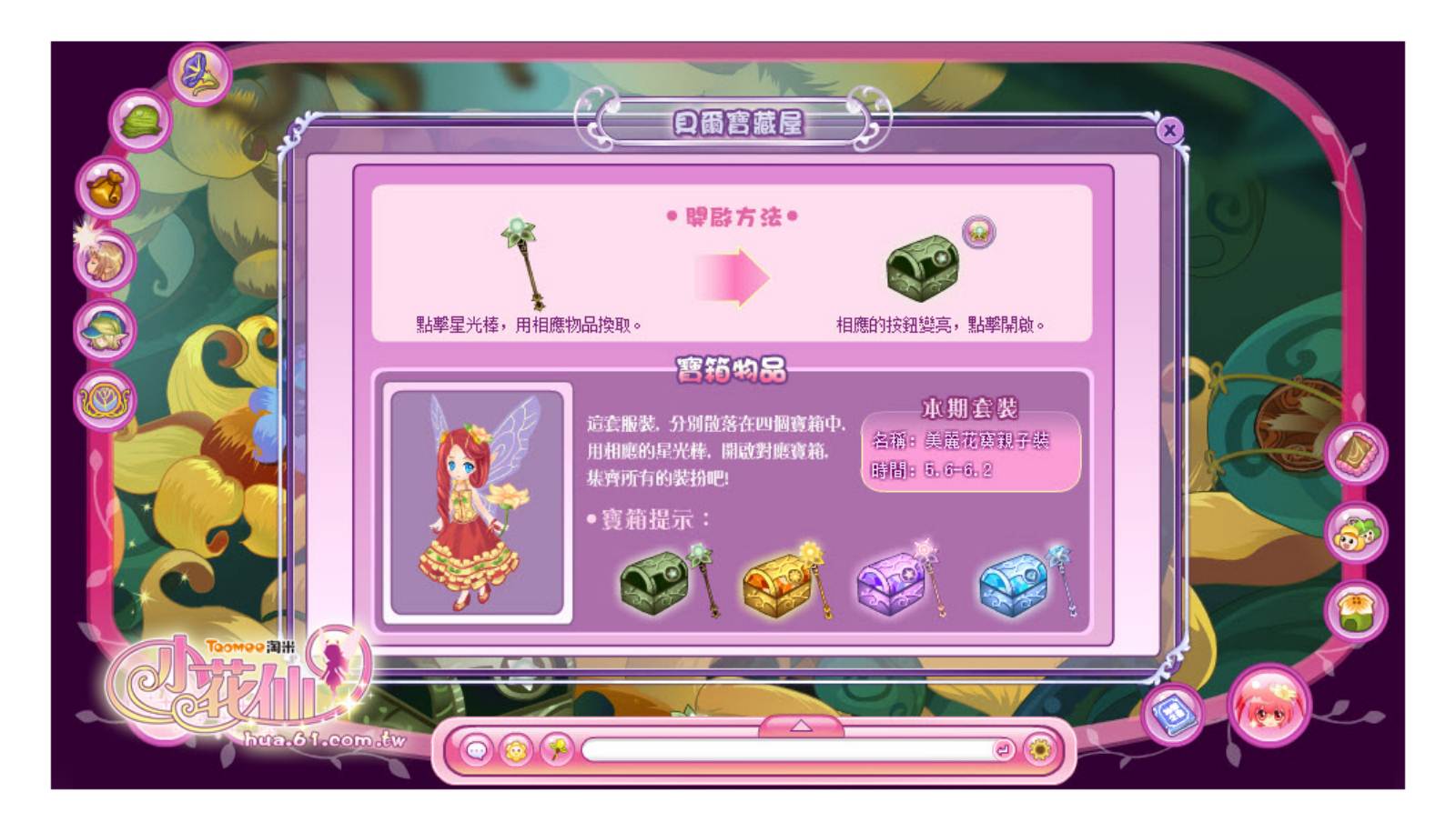 在大家的期盼下,貝爾寶藏箱的新裝扮登場啦,這次的裝扮相當引人注目,是可愛夢幻的美麗花寶親子套裝!想要跟小花寶相親相愛的穿著親子裝出現嗎?那就別錯過這次的精彩套莊!你跟你的小花寶,將會成為拉貝爾大陸最受注目的一對唷!