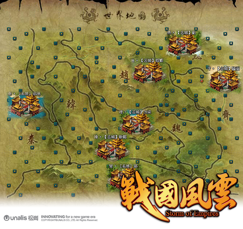 新城,部分城池的規格甚至有超越了天子皇城的等級,而這些散佈於世界各地的雄偉城池,亦同時扮演著捍衛各國主要通道的軍事要防,它們被泛稱為『名城』,由於名城不僅資源豐富,並在各國擔任鎮守要塞的要角,因此若能成功攻佔它國所有名城,即等同於顛覆了這個國家,每個國家的名城依據不同的道路相連,必須要依序擊破才能完成進攻吞食他國的大業,在各國謀士、諸侯之間共同的策略便是『掌控名城者–必奪天下』。
