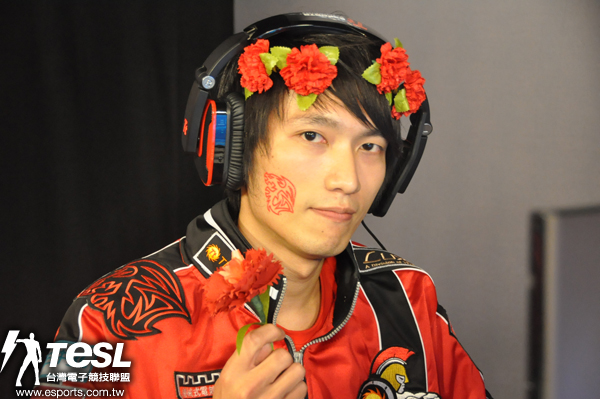 | 慶祝母親節而頭上載花出場的「人皇」Ball(詹鎮宇) |