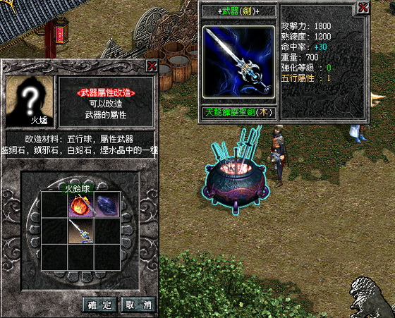 只要武器擁有五行屬性皆可進行武器屬性改造。玩家至青海省崑崙寺城寨火爐(40,95)處,點選武器屬性改造欄位,備妥任一種五行球(數值越高升級成功率越高)、任一種藍銅石、鎮邪石、白鉛石、煙水晶(使用等級越高成功率亦可提高)、武器屬性值 x100,000 的手續費即可進行武器屬性改造。改造後亦可能出現:武器完成改造(五行屬性值升級)、改造失敗(五行屬性不變)、改造失敗(五行屬性下降)、武器重置(五行屬性歸0)。改版後,除了副本與特定的任務怪物,所有的怪物均追加了隱藏屬性,所以只要玩家持改造後的屬性武器,可以追加 1.5% 至 60% 不等的傷害力,而五行武器的傷害力還是取決玩家自身的總攻擊力以及相剋怪才能達到最大效果。