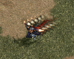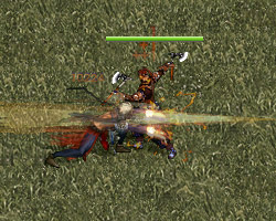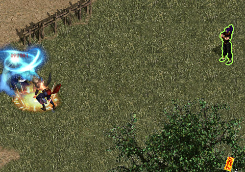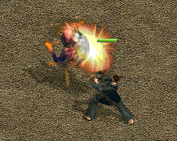 | 已聚氣完畢,武功蓄勢待發! | 瞄準對手後,鬼面血狼發出遠距離武功的同時,角色會瞬移到對手旁 |