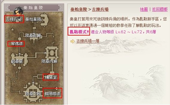在亂戰模式中,玩家們可在下副本前,預先進行戰術設定、分配職責(職責分為「破陣者」、「護陣者」、「襲陣者」),戰術的配置都將成為挑戰過關的成功要素,這部份是在考驗玩家們的職業與戰術組織技能。而【秦皇墓】的四個副本場景中,將有更大機率掉落「靈仙草」與「高品質坐騎」。