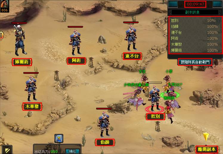 副本中有 6 個 BOSS,每個 BOSS 的實力不一,其中 5 個是小 BOSS,大 BOSS 是博爾術。隨著副本難度越高,與 BOSS 戰鬥獲得貴重獎勵的機率越大,在該全新的組隊副本中,玩家進入副本後可以看到其隊伍中的其它隊友,玩家必須先消滅 5 個小 BOSS 之後,才能挑戰博爾術,在副本中與 BOSS 戰鬥會損兵,點擊左下角的『補兵』按鈕可以補充兵力;玩家消滅地圖中每個 BOSS 人物都能獲得獎勵,與 BOSS 戰鬥可獲得兩種獎勵,一種是普通獎勵,一種是擊敗獎勵;與小 BOSS 戰鬥只會獲得天外隕石、靈石、