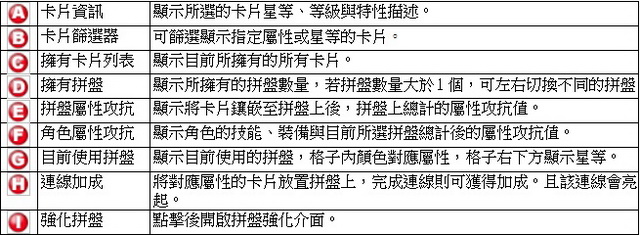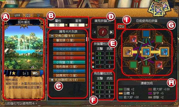 除了上述收集類的能力加成之外,玩家還可以透過獨特的「卡片拼盤系統」來組合出不同的屬性加成!拼盤可透過札林聯邦主線任務取得,玩家在有了拼盤之後,可以將已經貼入圖鑑的卡片置入拼盤來改變屬性攻抗組合,若將卡片放入與拼盤相同顏色的欄位,就有機會達成連線屬性加成。