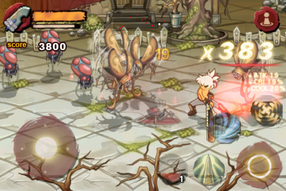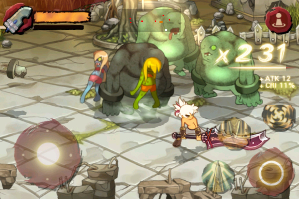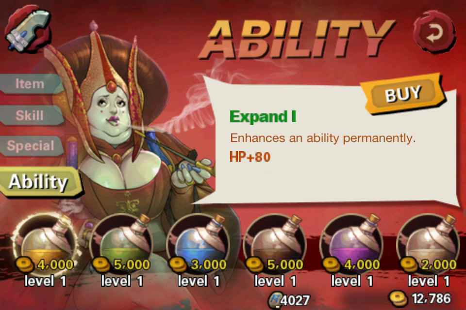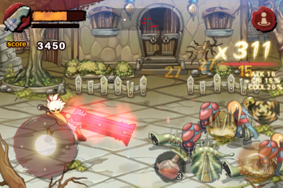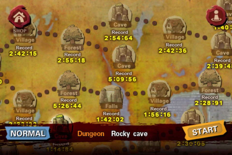 後續的關卡怪物除了會攻擊外,也會施放各種負面狀態來阻擾玩家,打倒怪物後有一定機率獲得金幣及寶石,這些可至商店升級裝備、購買藥水等。商店共分成項目(ITEM)、技能(SKILL)、特殊(SPECIAL)、能力(ABILITY)4 種類別,項目主要是花錢升級武器、防禦及購買藥水,技能是用寶石來升級或學習新技能,特殊則是強化武器與防禦、用金幣換寶石等,而能力主要是強化血量、攻擊、防禦等能力。