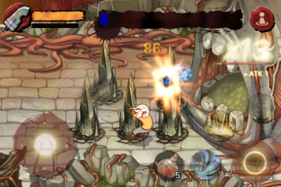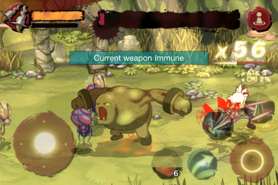 一開始必須先從第一個關卡慢慢往後破,進去後就學到大概的操作方式,滑動左下方控制鈕來移動方向、點擊方向控制鈕的中央為翻滾,右下方按鈕從左到右則分別為補血(消耗補水)、攻擊及施放技能(最多放 3 個),而點擊左上方武器圖案則是切換武器。