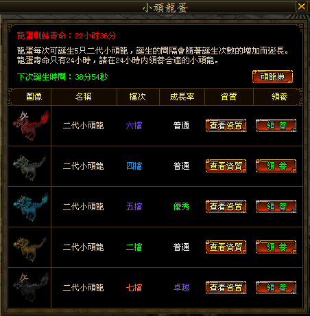 點擊【查看資質】可查看當前小頑龍的資質,點擊【領養】可進行領養。玩家要特別注意的是,當領養成功後,小頑龍蛋將會消失。