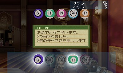 可以在賭場內遊玩迷你遊戲「撲克」和「選球抽獎」。撲克要從發的牌選出要交換的牌,湊齊兩個對子以上玩家就勝利。選球抽獎則要從 0~30 號的球之中選擇 5 顆並進行抽獎。