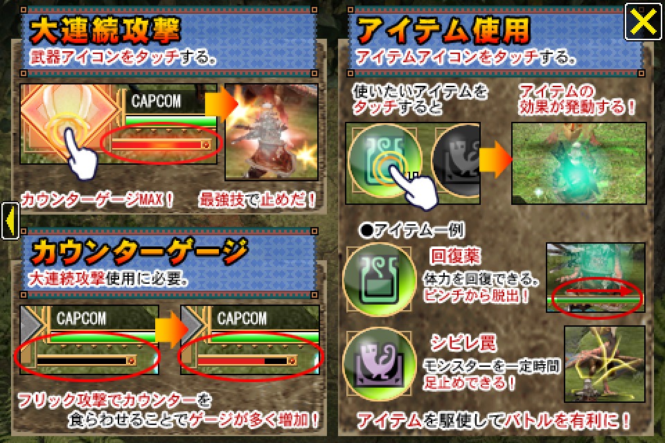 魔物獵人》系列的 iPhone /iPod touch 新作,收錄可輕鬆上手、短時間享受狩獵樂趣的內容,讓玩家透過簡單的拖拉、點擊、輕彈等手指動作來操作自己的獵人,運用多種武器狩獵系列作熟悉的怪獸。