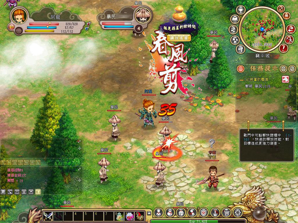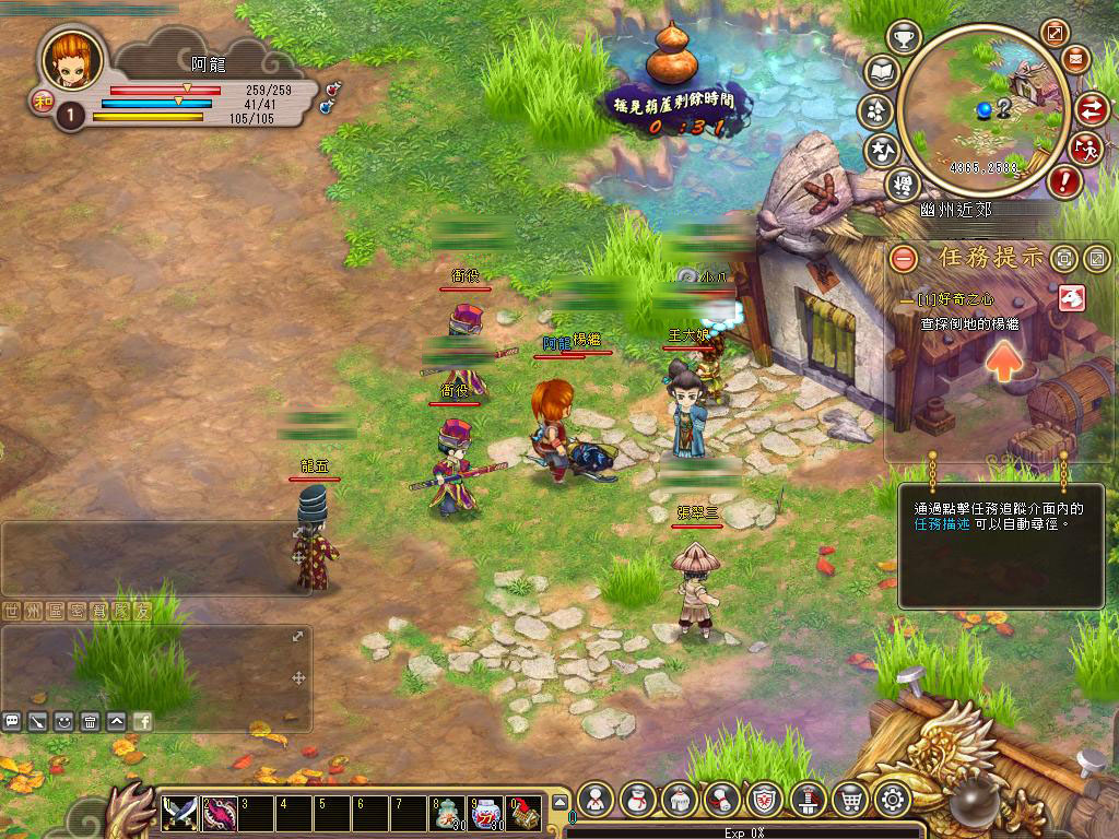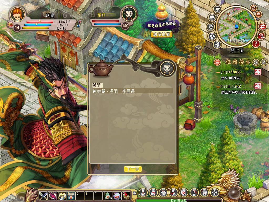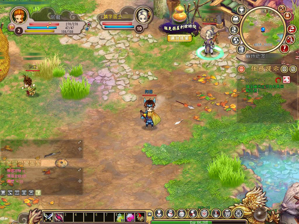 基本上只要順著劇情走,進行一些帶領玩家進入劇情且教導你裝上裝備的任務,只要輕鬆地點擊,很快的就能提升到 10 級,甚至於不需要打怪就能成長的相當快速,此階段在幫助玩家可以熟悉所有於龍騰三國都能常用的功能,完成任務到 10 級左右,就正式進入需要打怪的任務階段。雖然也可以不解任務的方式進行遊戲提昇等級,但在此階段還是乖乖的打怪會比較好喔!