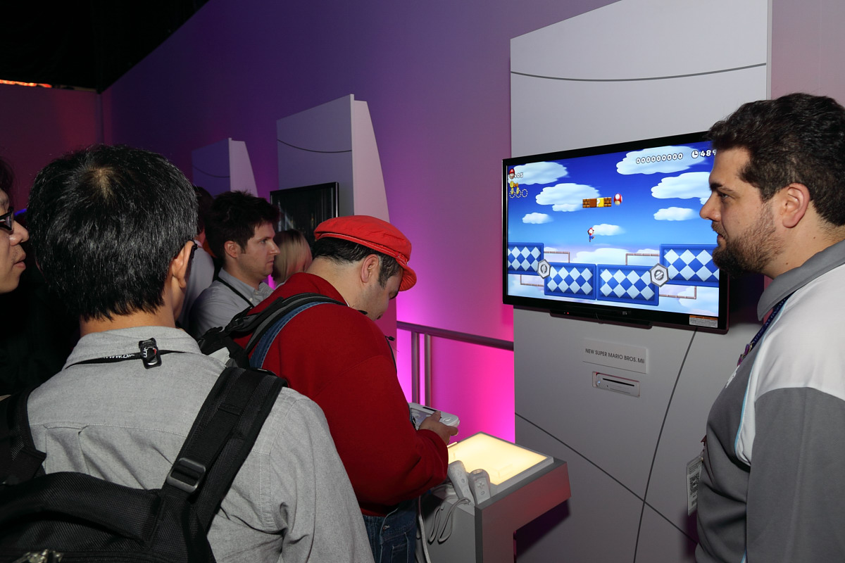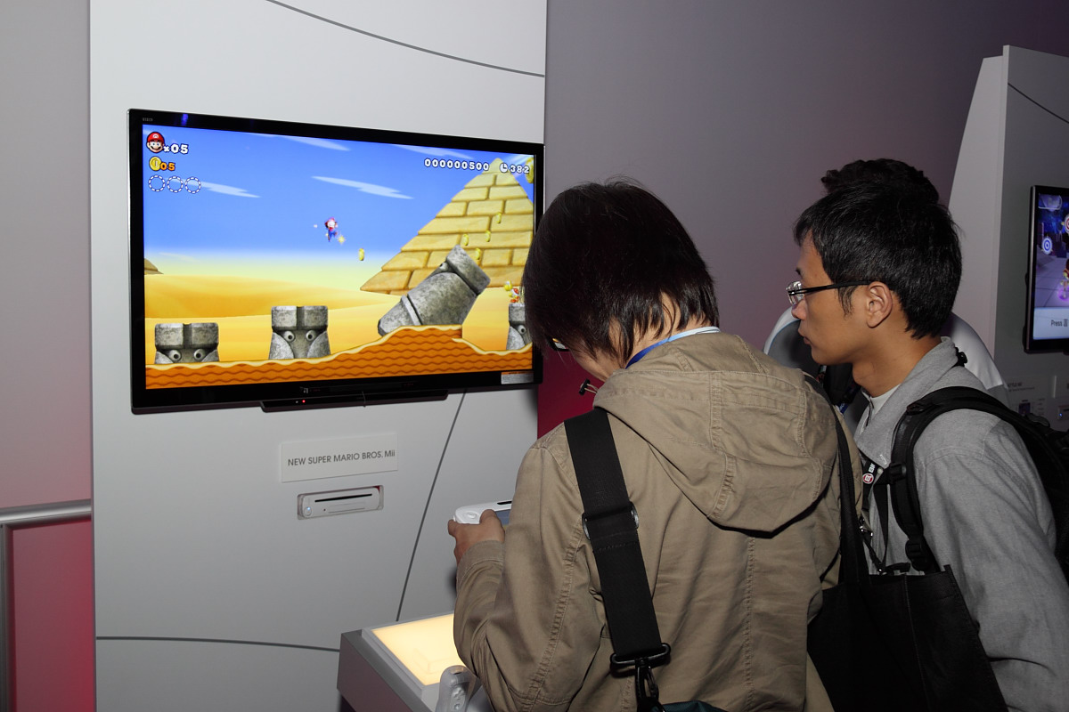 接著試玩的是比較接近真實遊戲的《新‧超級瑪利歐兄弟 Mii》,這款展示是以《新‧超級瑪利歐兄弟 Wii》為基礎所改編,玩法與 Wii 版大致相同,比較特殊的是玩家可以選擇以自己的 Mii 來遊玩。展示中 Wii U 控制器的用途比較單純,就是拿來操作遊戲角色以及顯示與電視螢幕上相同的遊戲畫面,即使家人要使用電視收看節目,也可以透過 Wii U 控制器上的螢幕繼續遊玩。