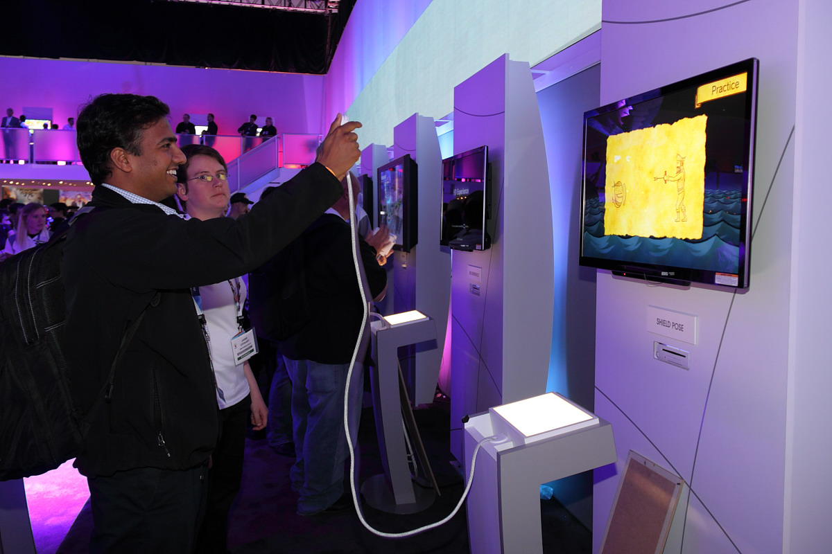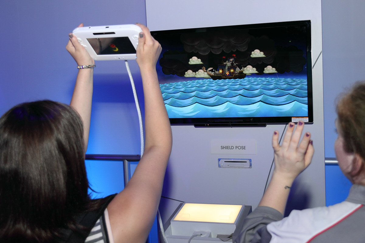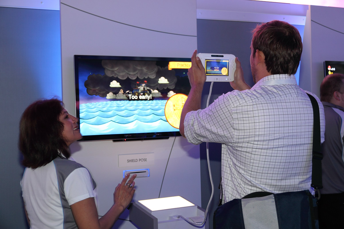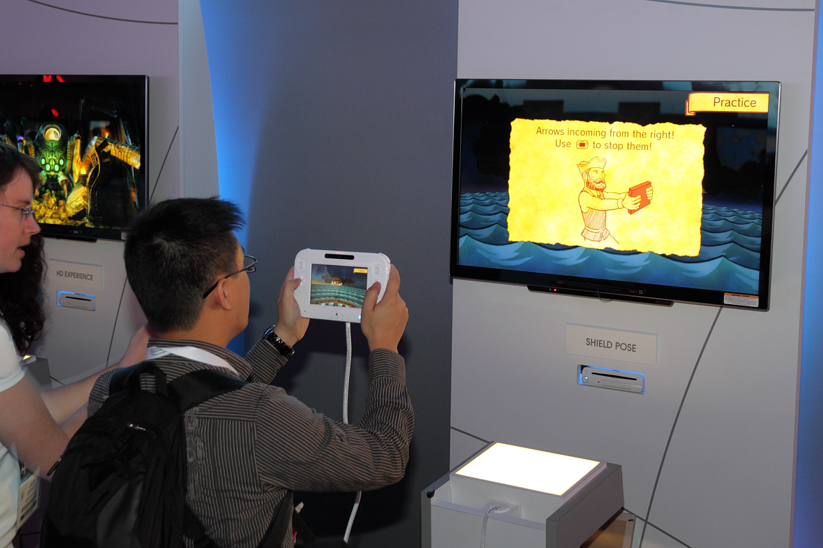 試玩中最引人注目的莫過於節奏感十足的《盾牌姿勢》。在這款音樂節奏玩法的展示中,玩家必須依照電視螢幕的畫面指示,舉起手中的 Wii U 控制器充當盾牌,抵擋從中上左右 4 個方向來襲的幽靈船飛箭。Wii U 控制器螢幕的畫面會隨著移動的方向而改變,可以擴展到電視螢幕所無法涵蓋的上下左右視野,轉向左邊就會看到左邊的幽靈船,朝向上面就會看到高掛天空的新月。