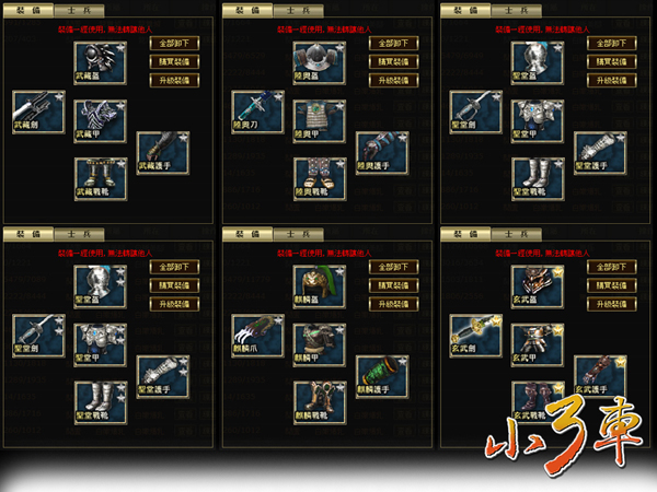 帶領軍隊的武將裝備共有十三種套裝,套裝加成的威力不可小覷。玩家利用各種加成寶石的鑲嵌功能也將有助於加攻擊、防禦、敏捷、統率等能力,士兵軍隊總共有五級二十種士兵,並分成步兵、弓兵、槍兵和騎兵,每種兵種之間則皆循環相剋。玩家要上戰場前除了必須先擬訂好策略,也必須利用國家的資源組裝所有士兵的武器和盔甲才能順利上戰場。