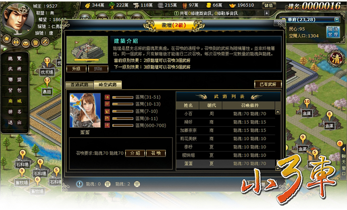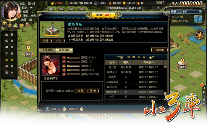小三車》除了有傳統的歷史名將之外,玩家還能召喚各個朝代的美女武將來增強戰鬥優勢,裡面的每一位武將都各具其特色,有的野性剽悍、戰力超群,有的溫柔可人、美麗白皙,除了可以在選擇介面中看到這些美女外,玩家更可以在武將介紹中看到她們的顛沛離奇身世,在巾幗不讓鬚眉的戰爭之中,平添幾許惆悵,而當玩家召喚小百和蛋蛋兩位美女將軍之後,更會得到意外驚喜。