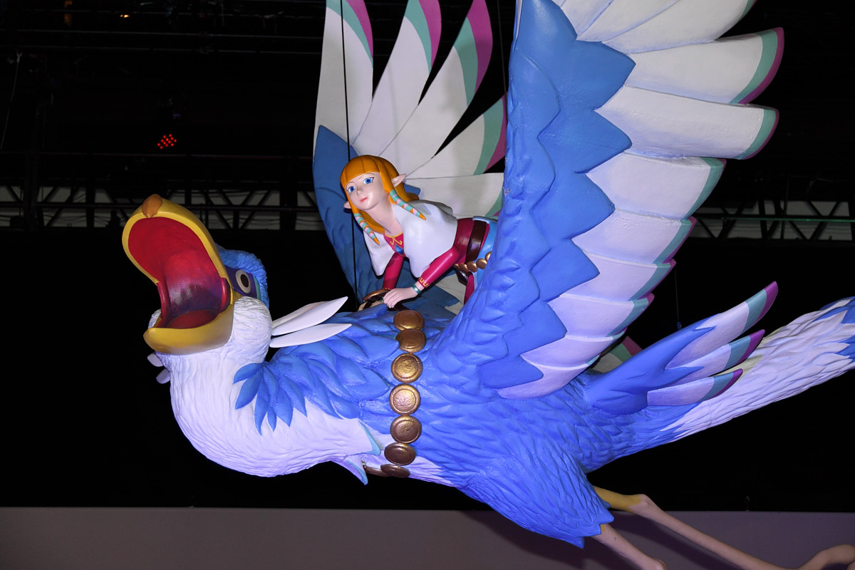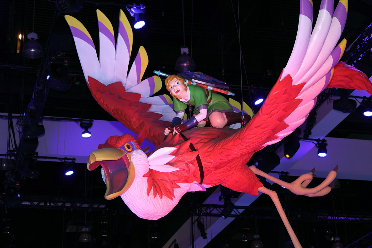 薩爾達傳說:天空之劍》,不過完成度比起去年高出許多,也已經確定會在今年耶誕節檔期正式推出。現場特別準備 6 台試玩機台供參觀者試玩,攤位上空還懸掛有林克與女主角騎乘大鳥的雕像。