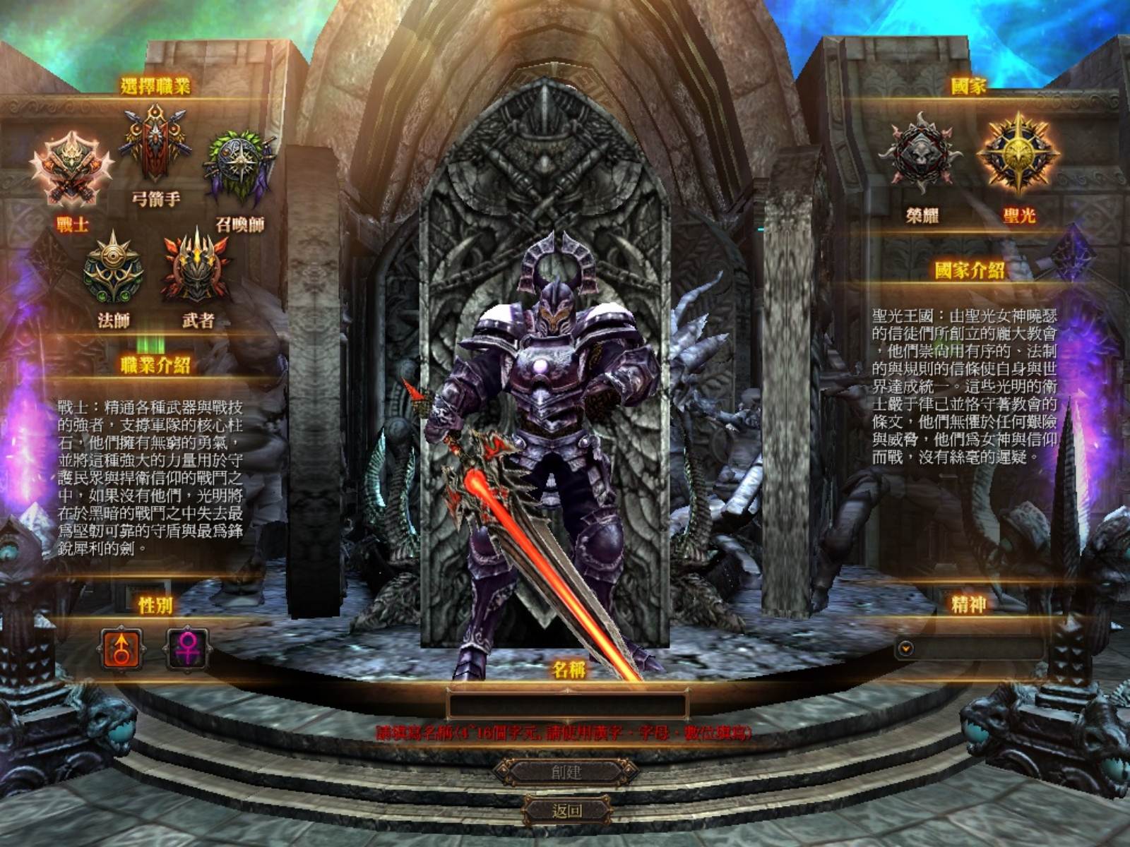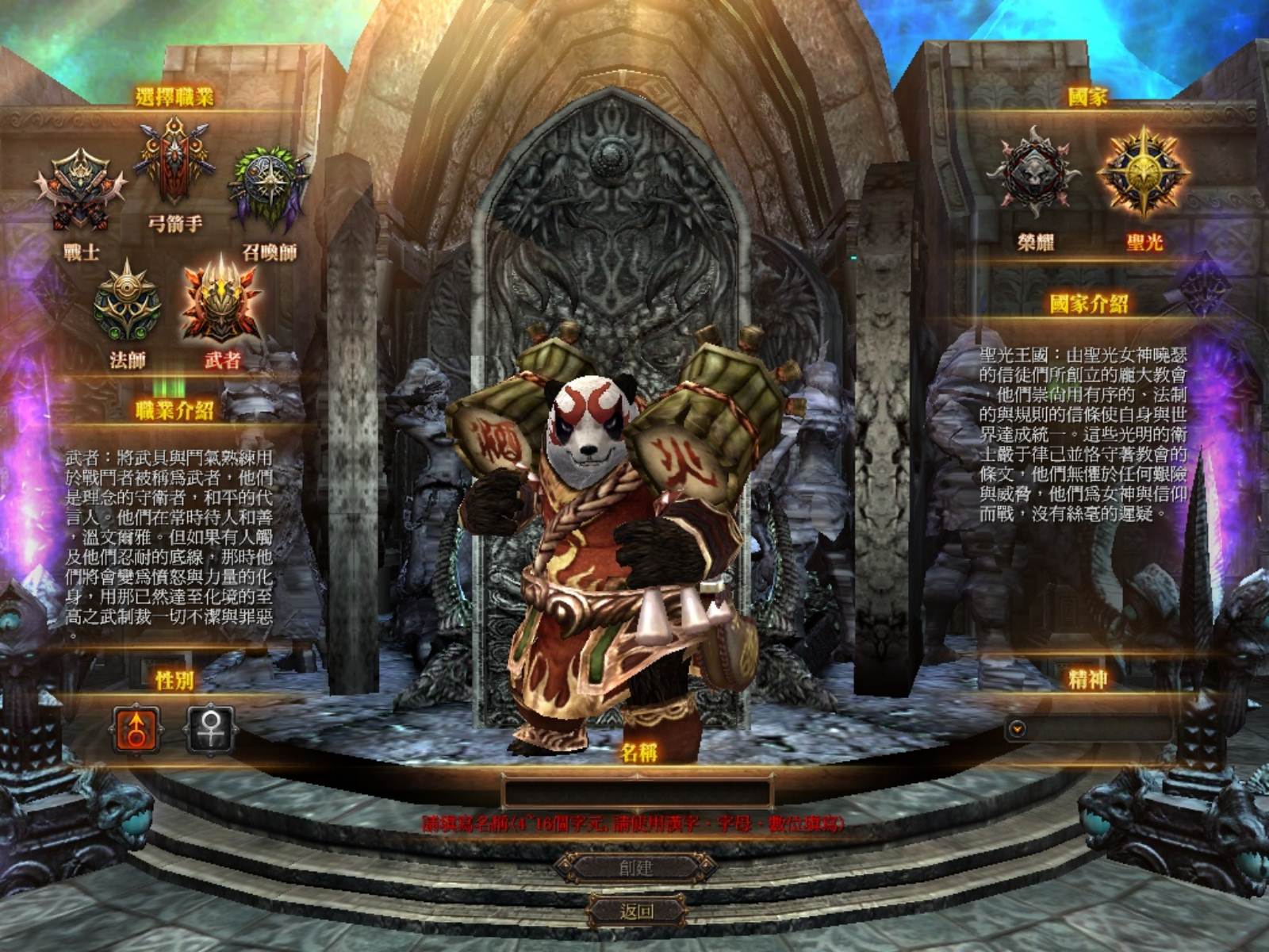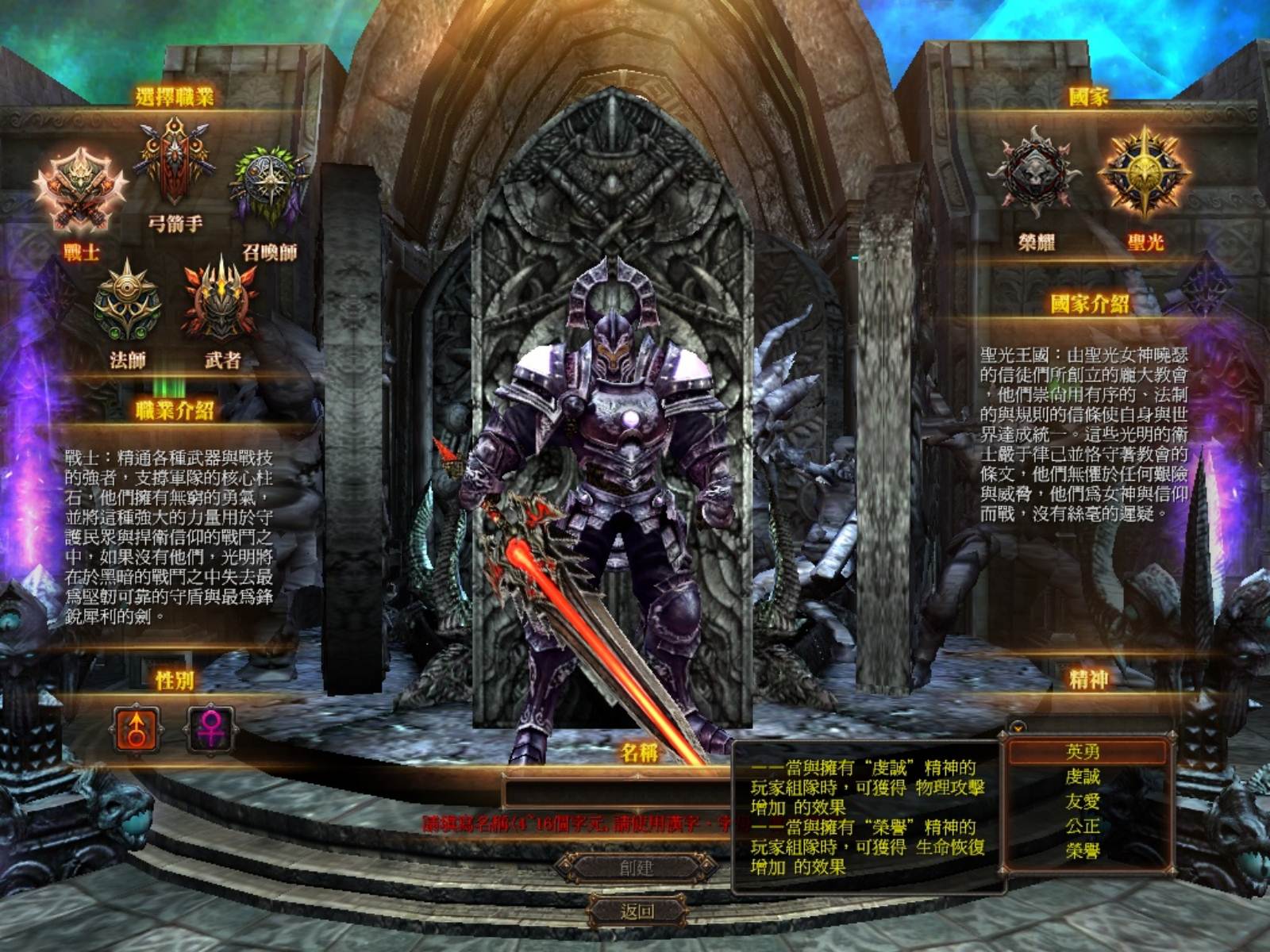 在選擇完職業後,除了性別與角色名稱外,國家有「榮耀」與「聖光」兩種選擇,喜歡參加國戰的朋友千萬請要慎選唷!另一個特殊的部份則是右下角的「精神系統」,選擇不同的系統(共有英勇、虔誠、友愛、公正、榮譽等五種)時,依據你的隊友精神選擇,將會得到不同的加成效果,相信因此也會大幅影響玩家未來的組隊意願,。