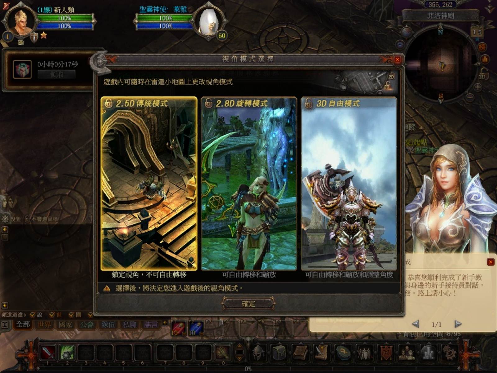 在新手教學過程中,系統會自動跳出三種不同的視角讓玩家們選擇,有 2.5D 的傳統模式、2.8D 的旋轉模式、3D 的自由模式。差別在於 2.5D 只能拉遠近,畫面角度是鎖死的。而 2.8D 則多了自由左右旋轉方向的選擇,3D 模式顧名思義就是可以上下左右前後全部自由旋轉了,在這邊小編推薦使用 2.8D 模式進行遊戲會比較方便。