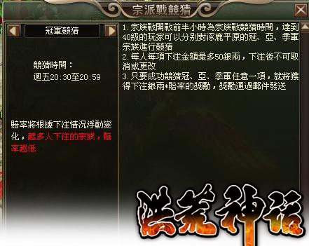 每週宗族戰開打前半小時為宗族戰競猜時間,只要達到 40 級的玩家即可分別對涿鹿平原的冠、亞和季軍宗派進行競猜,每人可下注的金額最多 50 銀兩,下注後不能再更改或取消,而只要成功猜到冠、亞、季軍任一項就將獲得下注銀兩賠率作為豐厚的獎勵,此外,在競猜介面上也可同步觀看到宗派混戰的戰況和各宗族的賠率等資訊。