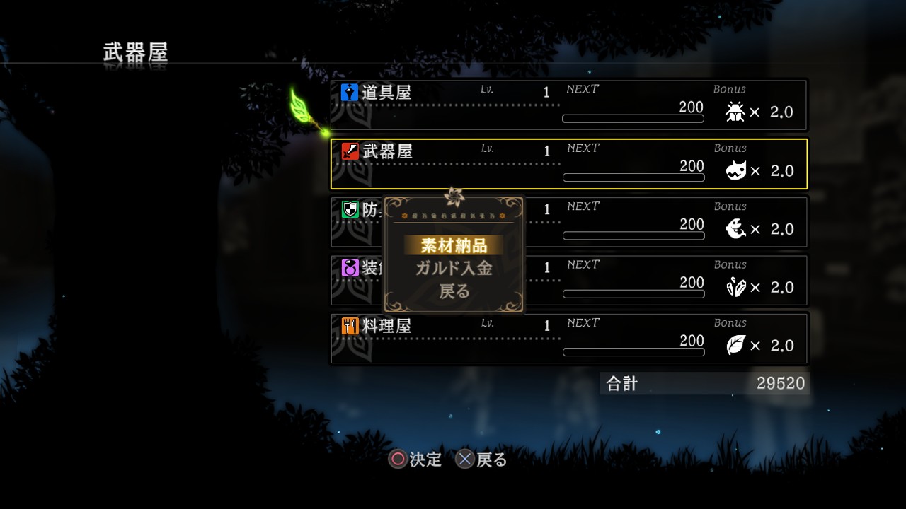 各種商店都是全國連鎖,因此不論在哪家分店都可以進行商店建設,成果也會由全國所有商店共享。另外,商店在不同時期會有不同的「獎勵素材」設定,當捐獻該種素材時,能獲得比平常更多的成長點數。獎勵素材設定會隨著時間經過或戰鬥場數而改變,切記要經常前往商店確認。