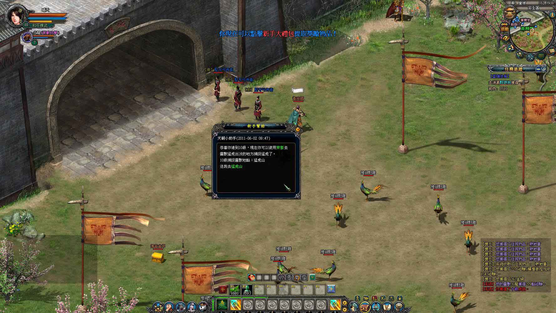 擊殺 8 隻野雞後任務就算完成,接下來就可以回報任務了。打怪任務前,玩家身上如果有經驗加倍的道具(可以從新手禮包、野外打怪、參加遊戲活動獲得)可得記得要先使用。