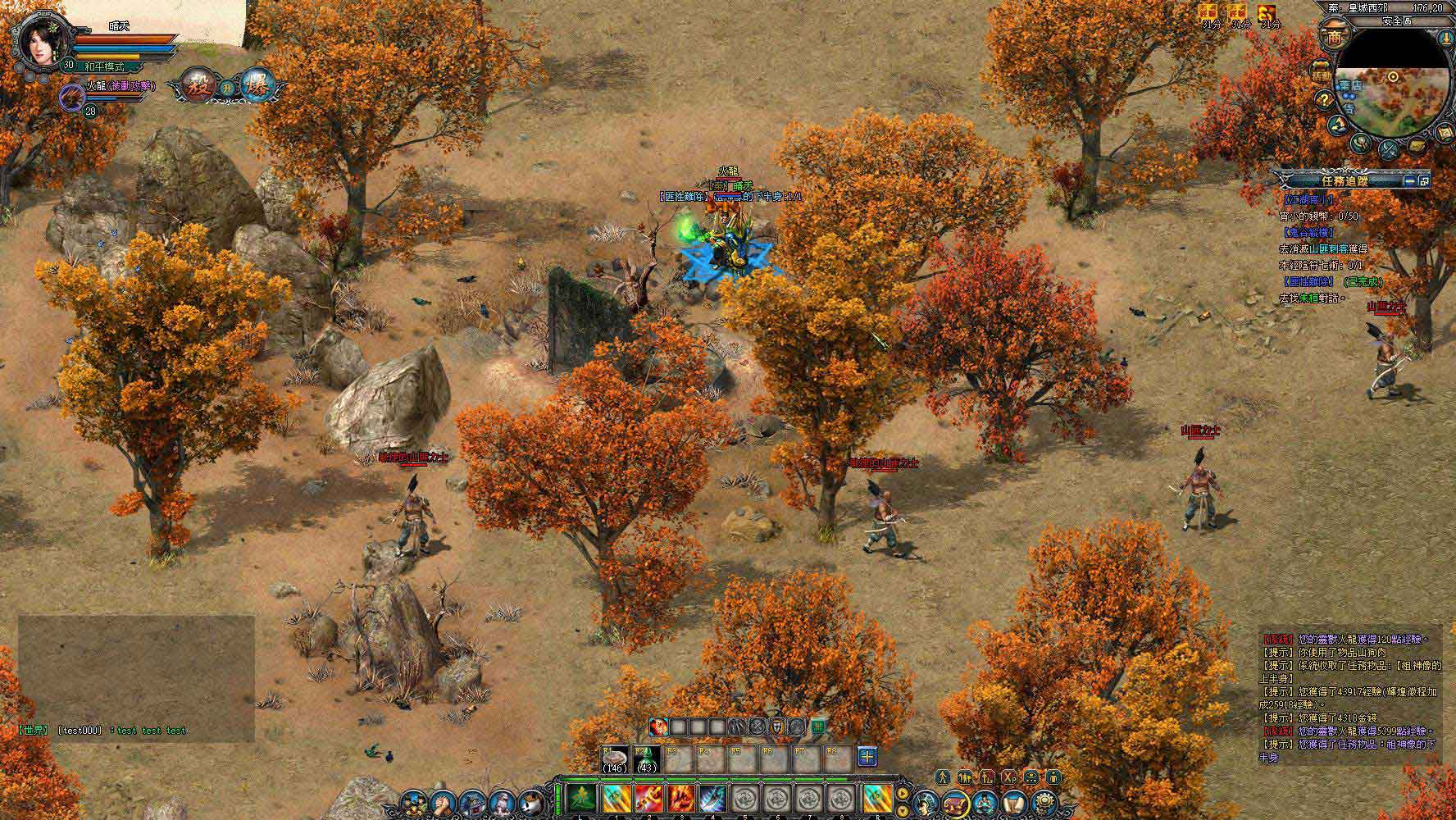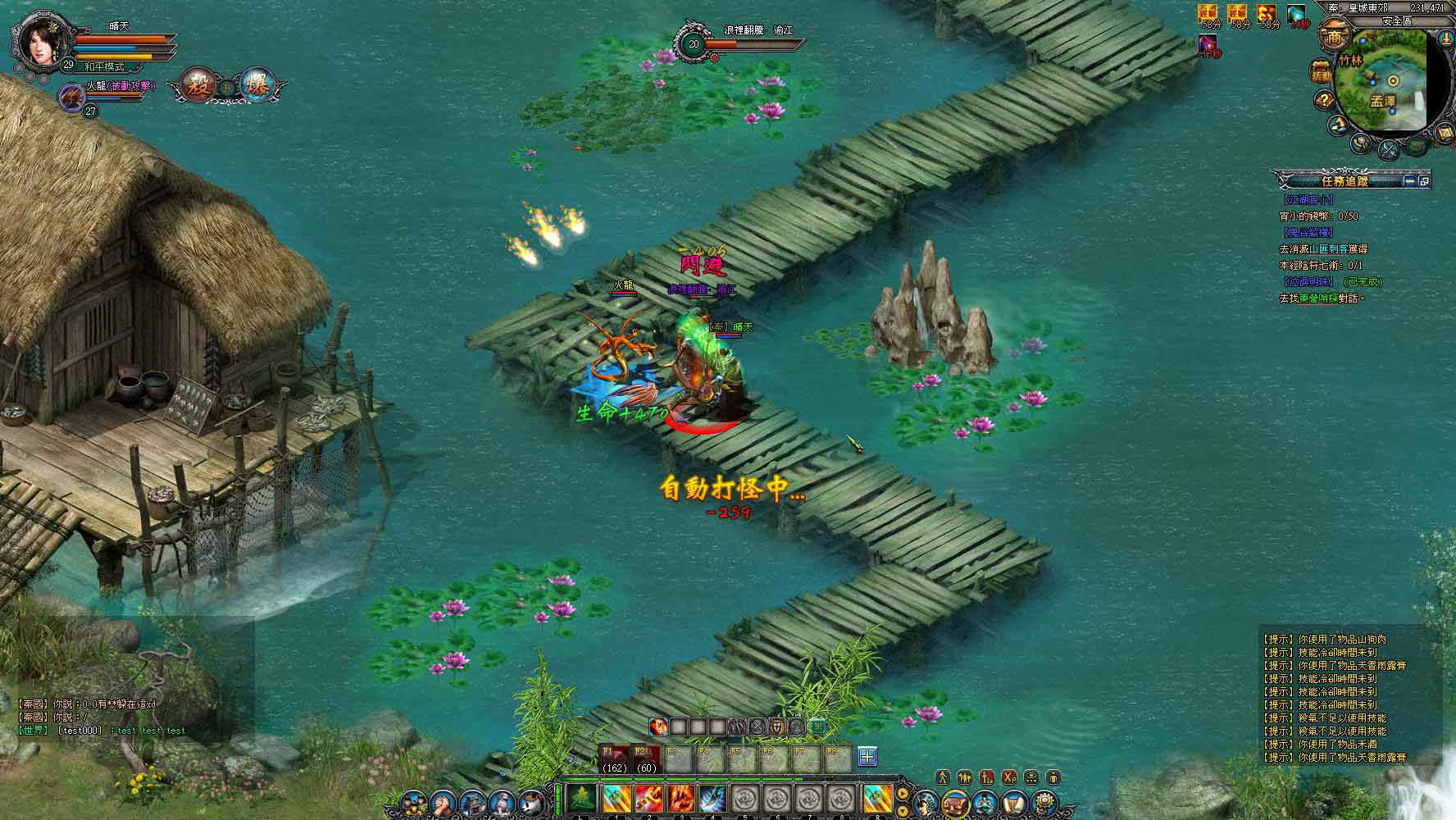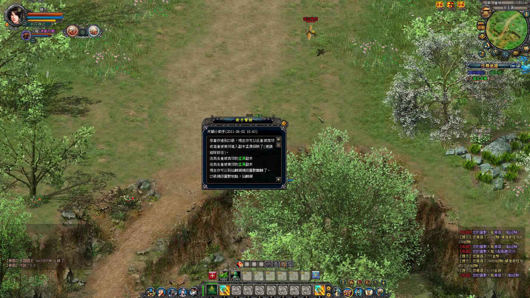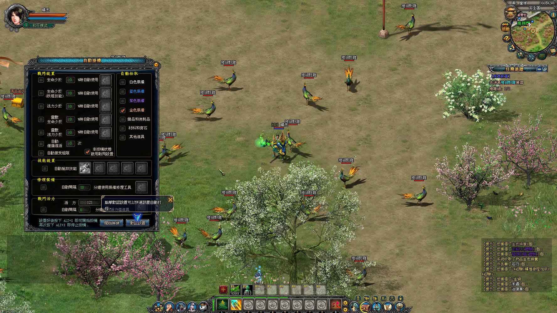 穿上裝備後往下移動一點可以看到很多隻野雞,玩家可以選擇使用滑鼠擊點怪物進行攻擊,或是使用遊戲中內建的免費自動掛機系統來進行打怪。玩家可以在自動掛機系統內針對戰鬥藥物補給、技能施放、裝備修理、戰鬥活力、自動拾取等功能進行設置,若是覺得設定太麻煩的話,只要點擊自動掛機介面右下角的“默認設置”,系統就會自動幫你將身上可用的補血藥和補法力的藥物配置到設定格內,也會自動幫玩家將可用的技能設置完成並開始進行打怪(如果已經設置過了,只要按下 ALT+X 就會開始打怪了)。