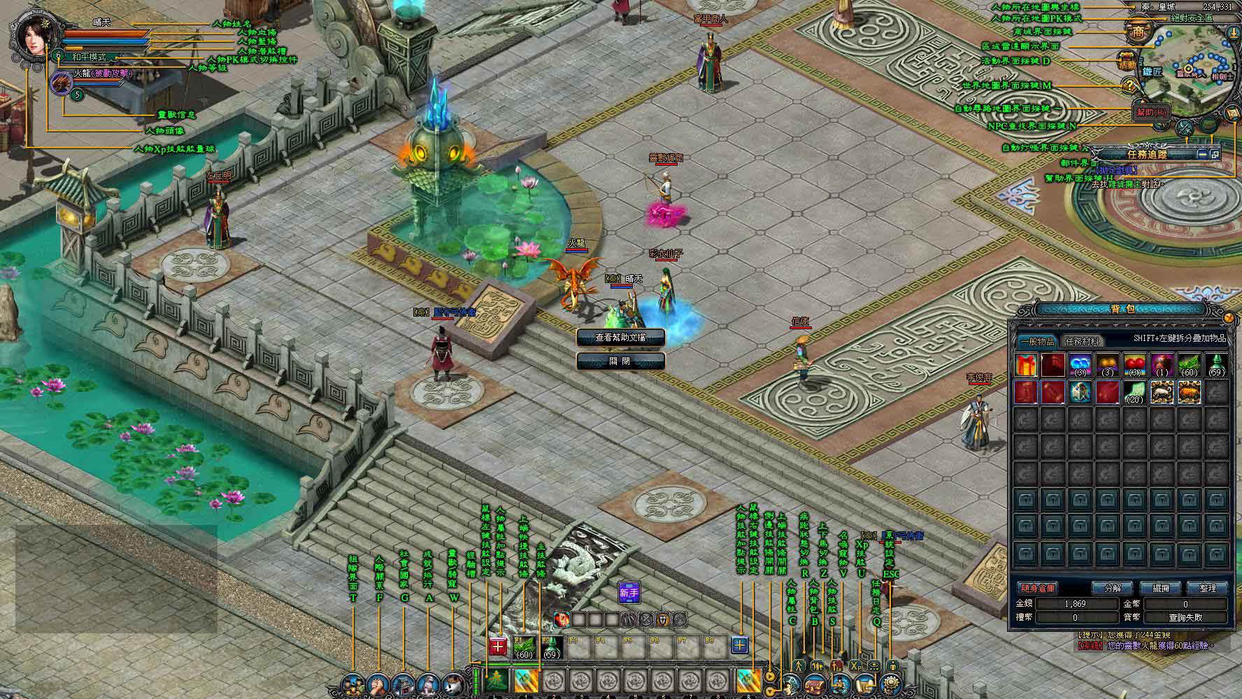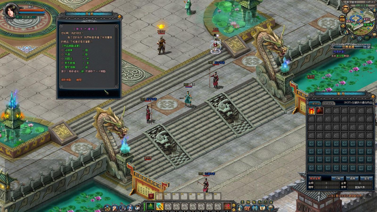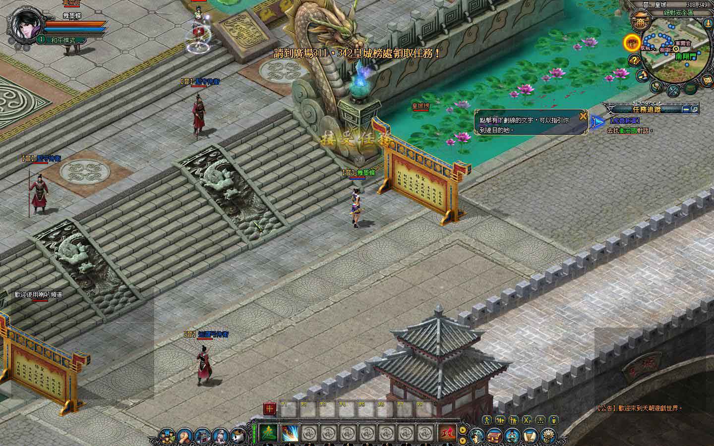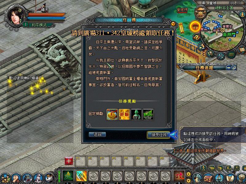 若是怕地圖太大,找不到路的玩家,可利用遊戲中的自動尋路系統。玩家在畫面的正中央可以看見一個任務方框,用滑鼠擊點後,角色會移動到皇榜前讓玩家接取任務,依照畫面指示將任務接取起來後,就可以看到畫面的右邊會出現任務追蹤,只要將滑鼠移到任務追蹤下方,擊點有劃線的字,系統就會自動引導到該任務 NPC 或任務目標處了。