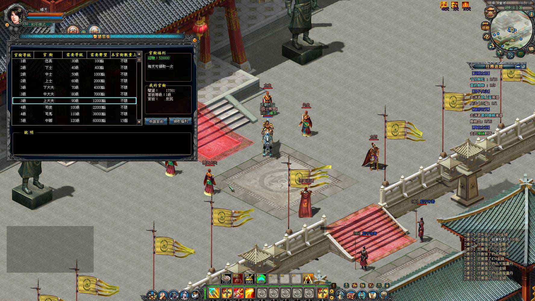 角色到了 30 級後,一定要記得先去皇城找 NPC 內史領取官職,但要領取官職前,必須先看聲望是否足夠 500。聲望的取得可以靠擊殺敵國玩家,或是殺死任何一隻 BOSS 級怪物來取得聲望,但小編要特別提醒玩家,被敵國玩家殺死的話則會扣減聲望,聲望夠符合的話才能領取相對應的官職,有了官職每天可以額外領取大量經驗和金錢,讓升等更加快速。