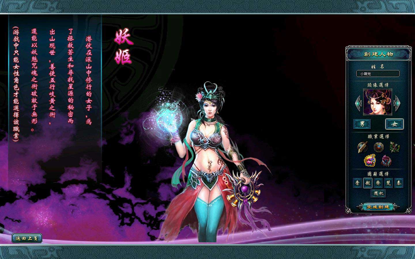 妖姬:妖姬善使五行歧黃之術,以妖魅巫咒破敵於無形。為了尋找星源的秘密,每位妖姬都需出山修行,一路以醫道拯救蒼生。妖姬的定位為牧師輔助類型,天賦可分為靈妖、咒師與巫姬。