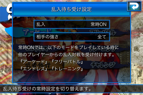 遊戲中玩家在單人遊玩時,只要開啟「等待亂入」設定,就可以讓來自遠端的其他同好連線亂入展開對決。與人對戰新增「挑戰賓果」功能,只要滿足對戰前設定的賓果盤條件,就可以獲得對應的 SP。不擅長與人對戰的玩家,也可以透過「武者修行」以「我的虛擬人偶」來一決勝負。
