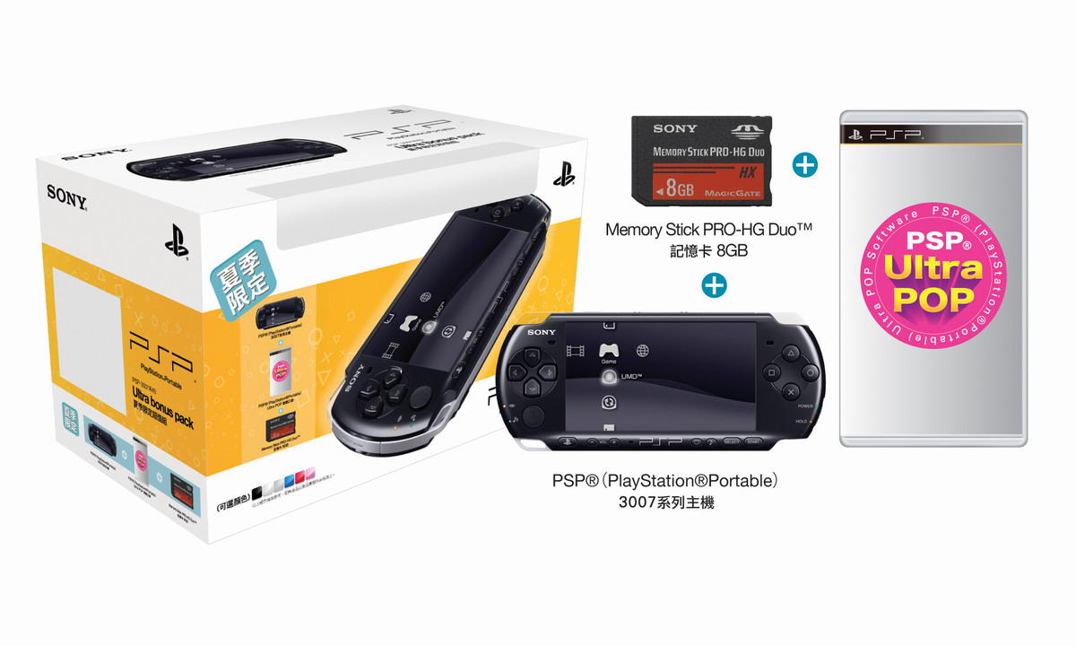 2011 年夏季限定推出的 PSP 夏日超值同梱組,內含 PSP 主機(PSP-3007 型,配色依通路庫存而定)1 台、PSP Ultra POP 遊戲 1 套與 Sony Memory Stick PRO-HG Duo 8GB 記憶卡 1 張。