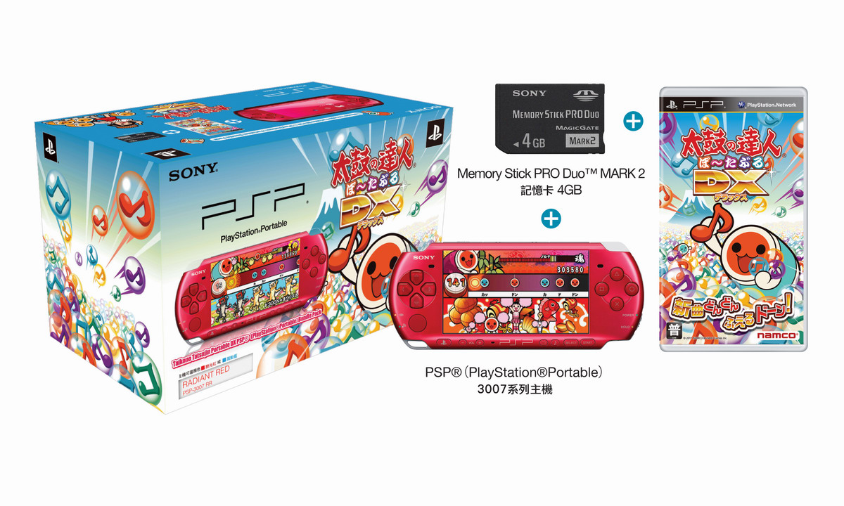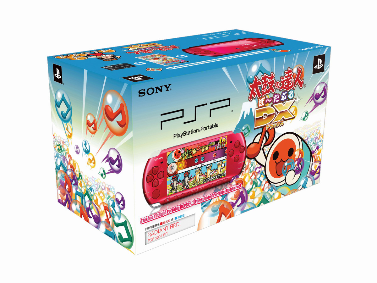 太鼓之達人 攜帶版 DX》同梱組,內含 PSP 主機(PSP-3007 型,艷光紅 / 躍動藍)1 台、PSP《